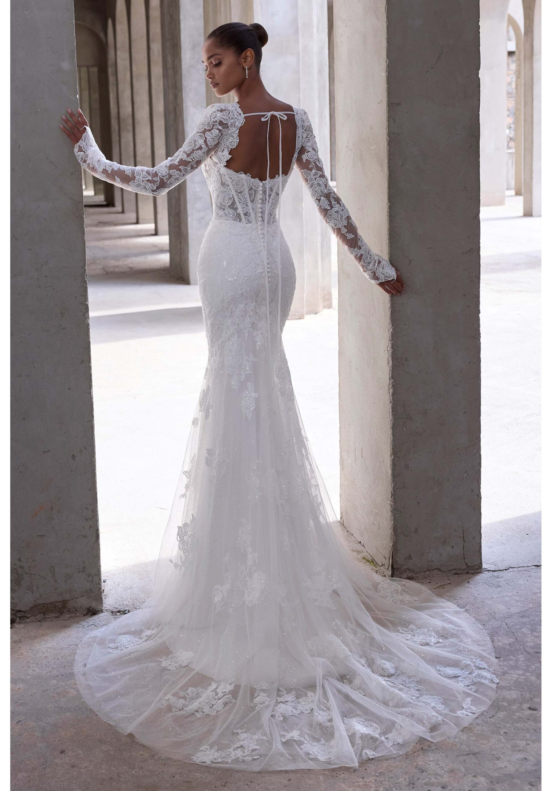 Robe de mariée, cintrée, tulle scintillante, manches amovibles.