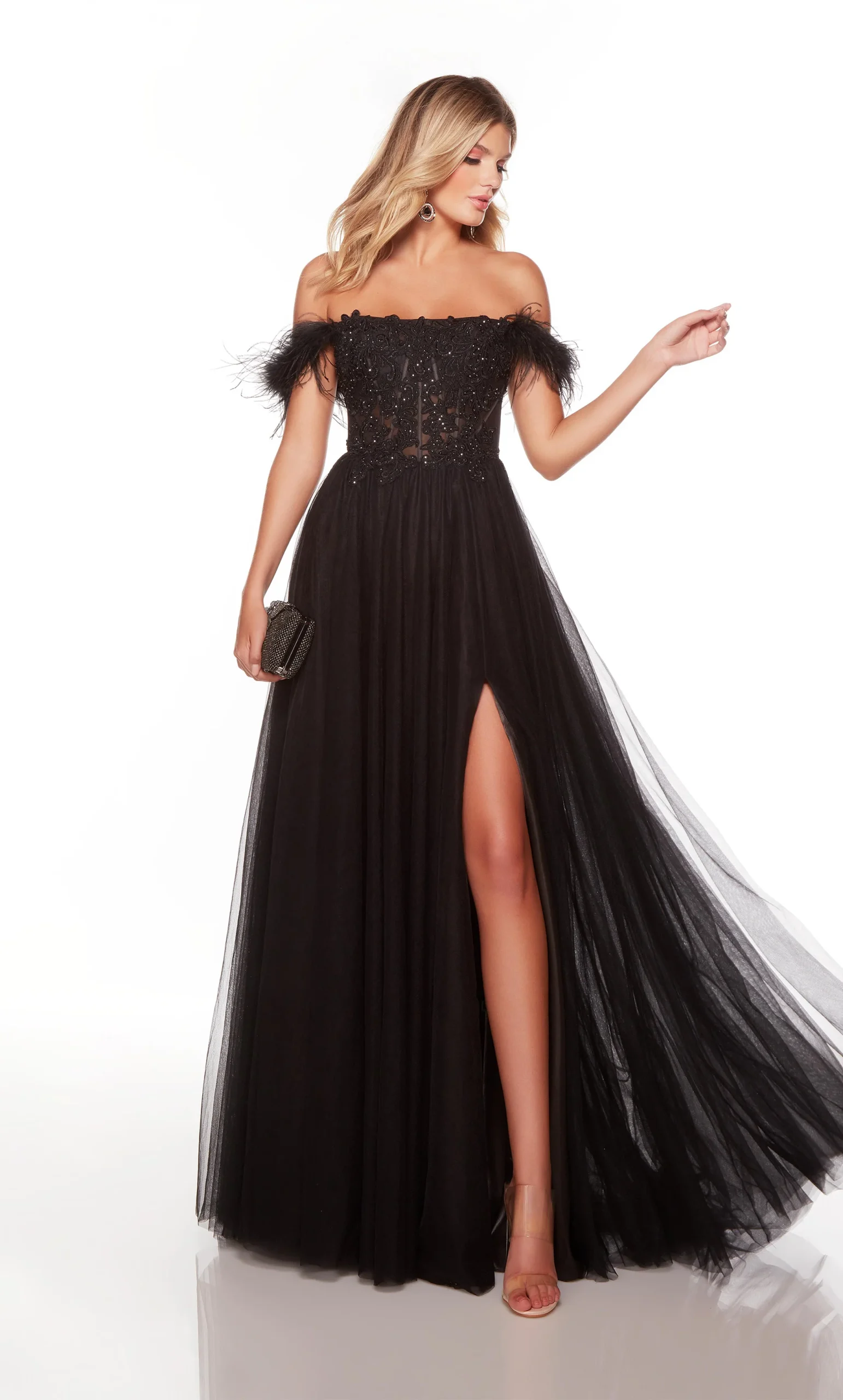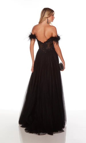 Robe de bal, ligne-A, Tulle-dentelle, Hors de l’épaule, Fluide, Dos ouvert, Corset en dentelle transparente, Plumes, Fente sur le côté, Traine