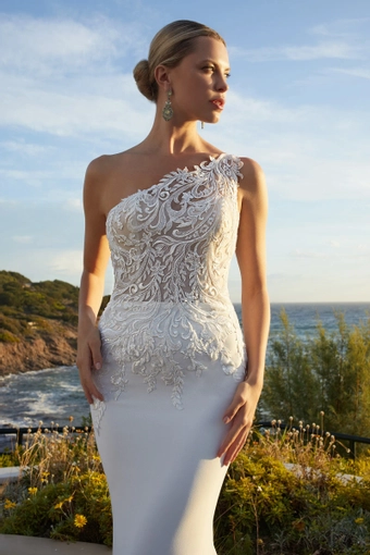 Robe de mariée, ajustée, en crêpe et dentelle sur une seul manche